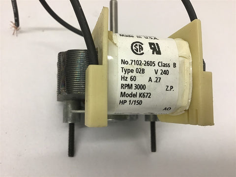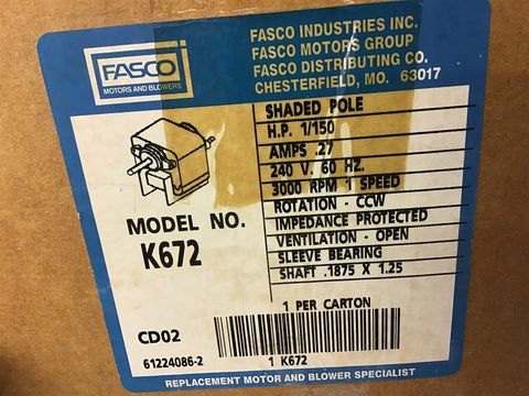 Fasco K672 1/150 Hp Blower Motor 240 Volts 3000 Rpm .27 Amps Return Policy Returns accepted within 30 days. Items sold as is cannot be returned, unless description is in error. Buyer pays return freight. Shipping Policy We ship almost all items with 1 business day of cleared payment. We ship USPS and UPS. We can ship on your account. If you will be shipping freight, please be sure to provide all delivery contact information including a phone number. We will need to know if you have a fork lift or dock.