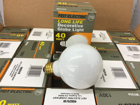 Feit Electric 40G25/W Light bulb 40 Watts Globe Bulb Return Policy Returns accepted within 30 days. Items sold as is cannot be returned, unless description is in error. Buyer pays return freight. Shipping Policy We ship almost all items with 1 business day of cleared payment. We ship USPS and UPS. We can ship on your account. If you will be shipping freight, please be sure to provide all delivery contact information including a phone number. We will need to know if you have a fork lift or dock.