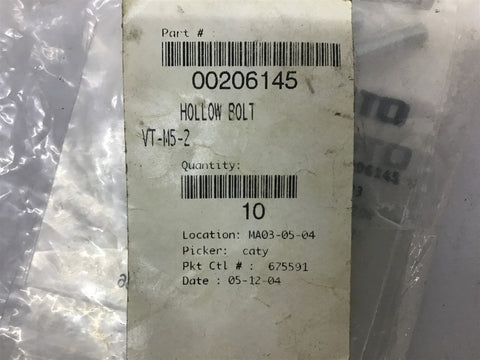 Festo VT-M5-2 Hollow Bolt Qty. 10 Return Policy Returns accepted within 30 days. Items sold as is cannot be returned, unless description is in error. Buyer pays return freight. Shipping Policy We ship almost all items with 1 business day of cleared payment. We ship USPS and UPS. We can ship on your account. If you will be shipping freight, please be sure to provide all delivery contact information including a phone number. We will need to know if you have a fork lift or dock.