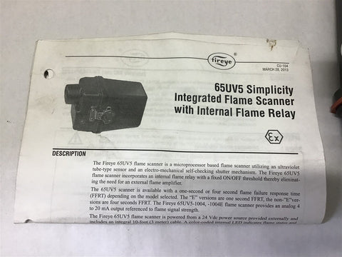 Fireye 65UV5-1004 Flame Scanner NPT Threads Return Policy Returns accepted within 30 days. Items sold as is cannot be returned, unless description is in error. Buyer pays return freight. Shipping Policy We ship almost all items with 1 business day of cleared payment. We ship USPS and UPS. We can ship on your account. If you will be shipping freight, please be sure to provide all delivery contact information including a phone number. We will need to know if you have a fork lift or dock.