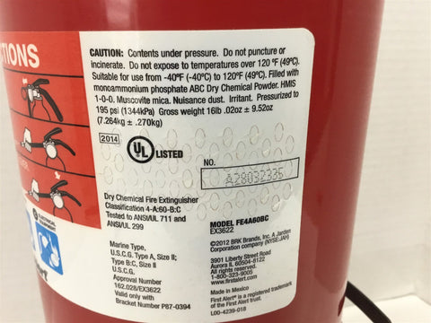 First Alert FE4A60BC Pro 10 Series Fire Extinguisher UL Rated 4-A:60-B:C Return Policy Returns accepted within 30 days. Items sold as is cannot be returned, unless description is in error. Buyer pays return freight. Shipping Policy We ship almost all items with 1 business day of cleared payment. We ship USPS and UPS. We can ship on your account. If you will be shipping freight, please be sure to provide all delivery contact information including a phone number. We will need to know if you have a fork lift or dock.