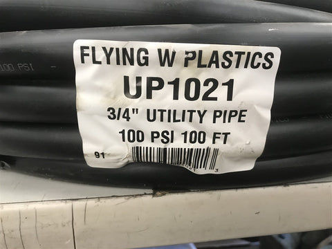 Flying W Plastics UP1021 3/4" Utility Pipe 100 PSI 100 FT Return Policy Returns accepted within 30 days. Items sold as is cannot be returned, unless description is in error. Buyer pays return freight. Shipping Policy We ship almost all items with 1 business day of cleared payment. We ship USPS and UPS. We can ship on your account. If you will be shipping freight, please be sure to provide all delivery contact information including a phone number. We will need to know if you have a fork lift or dock.