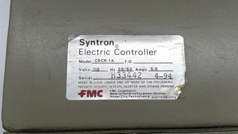 FMC CSCRA-1A Syntron Electric Controller H33442 Return Policy Returns accepted within 30 days. Items sold as is cannot be returned, unless description is in error. Buyer pays return freight. Shipping Policy We ship almost all items with 1 business day of cleared payment. We ship USPS and UPS. We can ship on your account. If you will be shipping freight, please be sure to provide all delivery contact information including a phone number. We will need to know if you have a fork lift or dock.