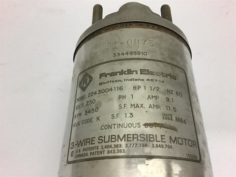 Franklin Electric 2243004116 Submersible Motor 1 1/2HP 230V 3450 RPM Return Policy Returns accepted within 30 days. Items sold as is cannot be returned, unless description is in error. Buyer pays return freight. Shipping Policy We ship almost all items with 1 business day of cleared payment. We ship USPS and UPS. We can ship on your account. If you will be shipping freight, please be sure to provide all delivery contact information including a phone number. We will need to know if you have a fork lift or dock.