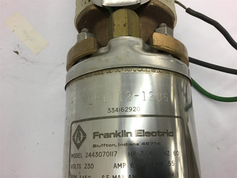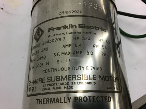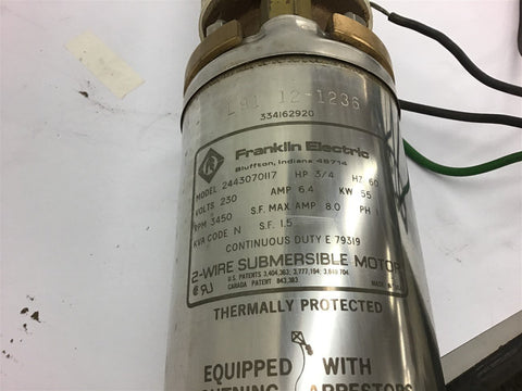 Franklin Electric 2443070117 Submersible Motor 3/4HP 230V 3450 RPM 2 Wire Return Policy Returns accepted within 30 days. Items sold as is cannot be returned, unless description is in error. Buyer pays return freight. Shipping Policy We ship almost all items with 1 business day of cleared payment. We ship USPS and UPS. We can ship on your account. If you will be shipping freight, please be sure to provide all delivery contact information including a phone number. We will need to know if you have a fork lift or dock.