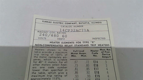 Furnas 14CP32A71 Magnetic Starter Open Enclosure Series B 240/480V 60HZ 3PH Return Policy Returns accepted within 30 days. Items sold as is cannot be returned, unless description is in error. Buyer pays return freight. Shipping Policy We ship almost all items with 1 business day of cleared payment. We ship USPS and UPS. We can ship on your account. If you will be shipping freight, please be sure to provide all delivery contact information including a phone number. We will need to know if you have a fork lift or dock.