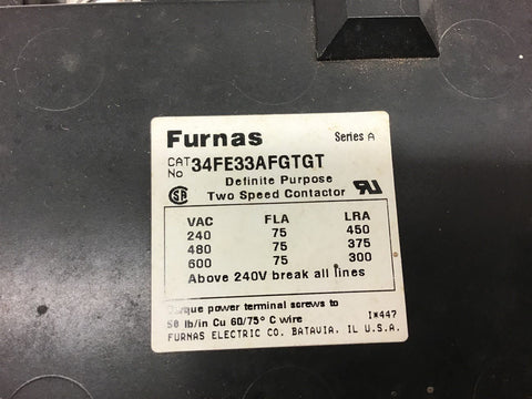 Furnas 34FE33AFGTGT Two speed Contactor 480 Volts 75 Amp Return Policy Returns accepted within 30 days. Items sold as is cannot be returned, unless description is in error. Buyer pays return freight. Shipping Policy We ship almost all items with 1 business day of cleared payment. We ship USPS and UPS. We can ship on your account. If you will be shipping freight, please be sure to provide all delivery contact information including a phone number. We will need to know if you have a fork lift or dock.