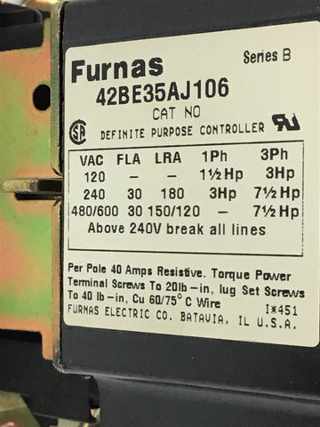Furnas 42BE35AJ106 Definite Purpose Contactor 30 Amp 240 volt 7 1/2 HP 110V Coil Return Policy Returns accepted within 30 days. Items sold as is cannot be returned, unless description is in error. Buyer pays return freight. Shipping Policy We ship almost all items with 1 business day of cleared payment. We ship USPS and UPS. We can ship on your account. If you will be shipping freight, please be sure to provide all delivery contact information including a phone number. We will need to know if you have a fork lift or dock.