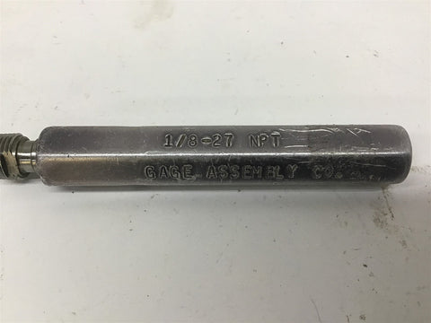 Gage Assembly Co 1/8-27 NPT Thread Pipe Plug Gage Return Policy Returns accepted within 30 days. Items sold as is cannot be returned, unless description is in error. Buyer pays return freight. Shipping Policy We ship almost all items with 1 business day of cleared payment. We ship USPS and UPS. We can ship on your account. If you will be shipping freight, please be sure to provide all delivery contact information including a phone number. We will need to know if you have a fork lift or dock.