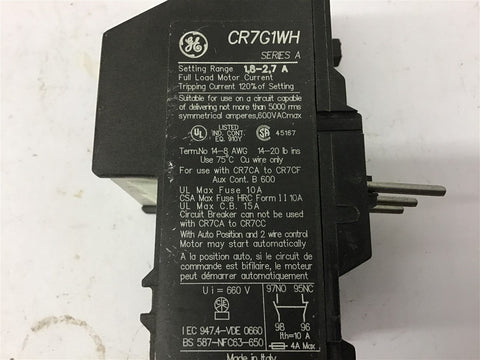 GE CR7G1WH 1.8-2.7 Amp Overload Relay Return Policy Returns accepted within 30 days. Items sold as is cannot be returned, unless description is in error. Buyer pays return freight. Shipping Policy We ship almost all items with 1 business day of cleared payment. We ship USPS and UPS. We can ship on your account. If you will be shipping freight, please be sure to provide all delivery contact information including a phone number. We will need to know if you have a fork lift or dock.