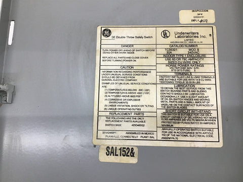 GE TC35321 Double Throw Safety Switch 30 Amp 240 Vac Return Policy Returns accepted within 30 days. Items sold as is cannot be returned, unless description is in error. Buyer pays return freight. Shipping Policy We ship almost all items with 1 business day of cleared payment. We ship USPS and UPS. We can ship on your account. If you will be shipping freight, please be sure to provide all delivery contact information including a phone number. We will need to know if you have a fork lift or dock.