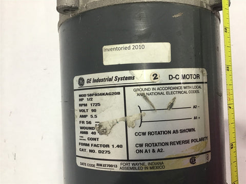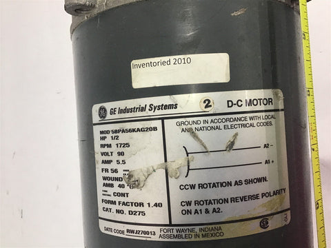 General Electric 5BPA56KAG20B DC Motor D275 1/2HP 90V 1725RPM 56-FR Return Policy Returns accepted within 30 days. Items sold as is cannot be returned, unless description is in error. Buyer pays return freight. Shipping Policy We ship almost all items with 1 business day of cleared payment. We ship USPS and UPS. We can ship on your account. If you will be shipping freight, please be sure to provide all delivery contact information including a phone number. We will need to know if you have a fork lift or dock.