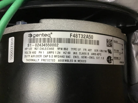 Genteq F48T32A50 AC Motor 1/3 HP 460 V 850 RPM 8P 48Y SEMI ENCL Return Policy Returns accepted within 30 days. Items sold as is cannot be returned, unless description is in error. Buyer pays return freight. Shipping Policy We ship almost all items with 1 business day of cleared payment. We ship USPS and UPS. We can ship on your account. If you will be shipping freight, please be sure to provide all delivery contact information including a phone number. We will need to know if you have a fork lift or dock.