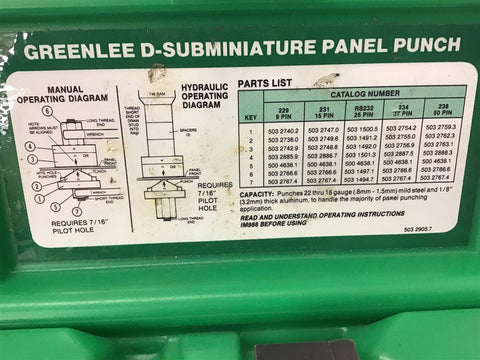 Greenlee 229 9-Pin D-Subminiature Panel Punch Return Policy Returns accepted within 30 days. Items sold as is cannot be returned, unless description is in error. Buyer pays return freight. Shipping Policy We ship almost all items with 1 business day of cleared payment. We ship USPS and UPS. We can ship on your account. If you will be shipping freight, please be sure to provide all delivery contact information including a phone number. We will need to know if you have a fork lift or dock.