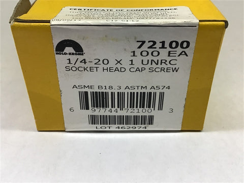 Holo-Krome 1/4-20 x 1 UNRC 72100 100 Ea Socket Head Cap Screw Return Policy Returns accepted within 30 days. Items sold as is cannot be returned, unless description is in error. Buyer pays return freight. Shipping Policy We ship almost all items with 1 business day of cleared payment. We ship USPS and UPS. We can ship on your account. If you will be shipping freight, please be sure to provide all delivery contact information including a phone number. We will need to know if you have a fork lift or dock.
