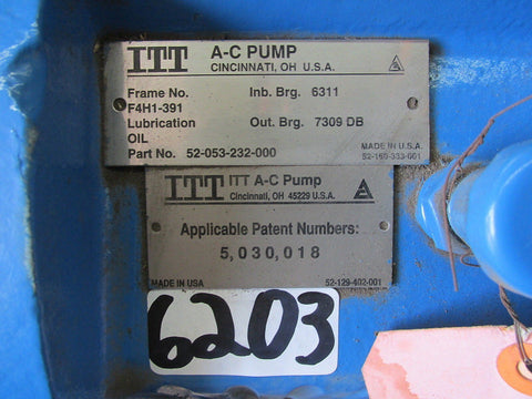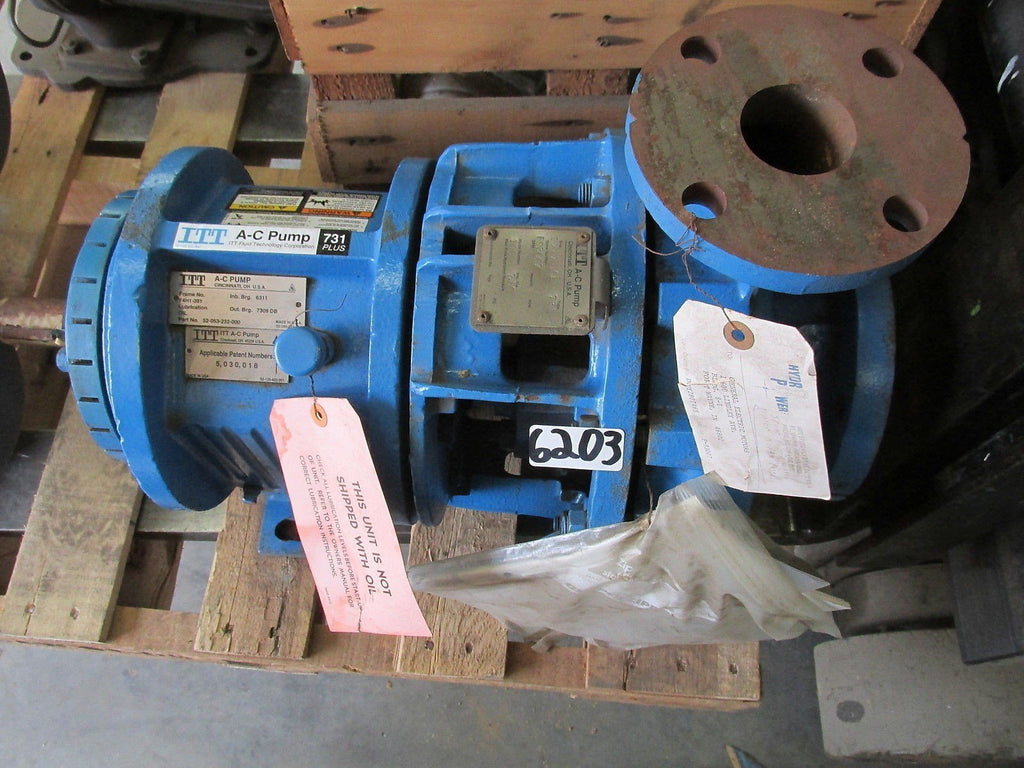 1 ITT A-C Pump 731 Plus, Size 3X2X8.5E, Frame # F4H1-391, P/N: 52-053-232-000, S/N F93007, Model #100, Imp. Diam 7.8", Shipped w/out oil, 4 Bolt flange plumbing, Comes with manual, Selling as rebuilt, Appears new, Has a hydro-power tag. 6203 c-6-9-4-b freight 210# ss48