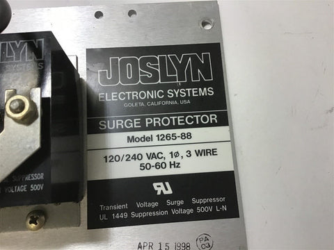JOSLYN SURGE PROTECTOR 1265-88 120/240 VAC 3 WIRE 50-60 Hz Payment Policy Payment through PayPal or Contact Brooks Motor & Electric for Credit Card approval. Return Policy Returns accepted within 30 days. Items sold as is cannot be returned, unless description is in error. Buyer pays return freight. Shipping Policy We ship almost all items within 1 business day of cleared payment in the United States. We ship USPS, UPS, and Ebay Global Shipping Program. We can ship on your account only in the Unites States. If you will be shipping freight, please be sure to provide all delivery contact information including a phone number. We will need to know if you have a fork lift or dock. International shipments do not apply to this. Shipments will be handled through Ebay Global Shipping warehouse.