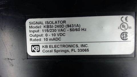 KB EKECTRONICS KBSI-240D REV 3011952, SIGNAL ISOLATOR, 115/230V, 0-10 VDC OUTPUT Return Policy Returns accepted within 30 days. Items sold as is cannot be returned, unless description is in error. Buyer pays return freight. Shipping Policy We ship almost all items with 1 business day of cleared payment. We ship USPS and UPS. We can ship on your account. If you will be shipping freight, please be sure to provide all delivery contact information including a phone number. We will need to know if you have a fork lift or dock.