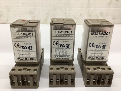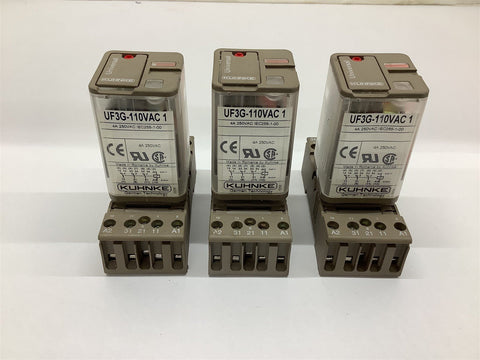 Kuhnke UF3G-110Vac 1 4 Amp 250 Vac Relay Lot Of 3 Return Policy Returns accepted within 30 days. Items sold as is cannot be returned, unless description is in error. Buyer pays return freight. Shipping Policy We ship almost all items with 1 business day of cleared payment. We ship USPS and UPS. We can ship on your account. If you will be shipping freight, please be sure to provide all delivery contact information including a phone number. We will need to know if you have a fork lift or dock.
