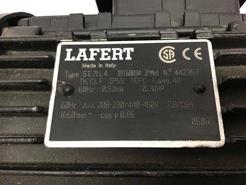 Lafert ST 71L4 Motor 0.70HP 208-290/440-460V TEFC Return Policy Returns accepted within 30 days. Items sold as is cannot be returned, unless description is in error. Buyer pays return freight. Shipping Policy We ship almost all items with 1 business day of cleared payment. We ship USPS and UPS. We can ship on your account. If you will be shipping freight, please be sure to provide all delivery contact information including a phone number. We will need to know if you have a fork lift or dock.