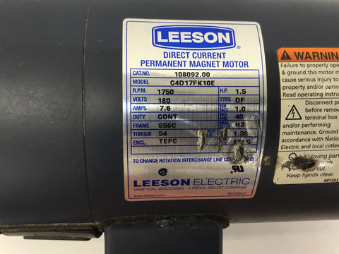 LEESON 108092.00 DC Motor Return Policy Returns accepted within 30 days. Items sold as is cannot be returned, unless description is in error. Buyer pays return freight. Shipping Policy We ship almost all items with 1 business day of cleared payment. We ship USPS and UPS. We can ship on your account. If you will be shipping freight, please be sure to provide all delivery contact information including a phone number. We will need to know if you have a fork lift or dock.