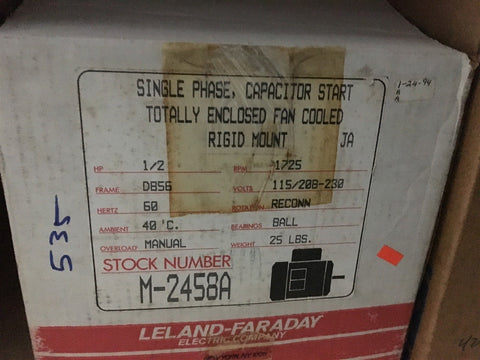 LELAND FARADAY M-2458A 1PH 1/2HP D856FR 60HZ 1725RPM 115/208-230V Return Policy Returns accepted within 30 days. Items sold as is cannot be returned, unless description is in error. Buyer pays return freight. Shipping Policy We ship almost all items with 1 business day of cleared payment. We ship USPS and UPS. We can ship on your account. If you will be shipping freight, please be sure to provide all delivery contact information including a phone number. We will need to know if you have a fork lift or dock.