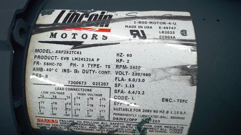 LINCOLN LM24121A 2 HP COOLING FAN 230/460 VOLT, 3450 RPM, 2P, 56HC-70 FRAME Return Policy Returns accepted within 30 days. Items sold as is cannot be returned, unless description is in error. Buyer pays return freight. Shipping Policy We ship almost all items with 1 business day of cleared payment. We ship USPS and UPS. We can ship on your account. If you will be shipping freight, please be sure to provide all delivery contact information including a phone number. We will need to know if you have a fork lift or dock.