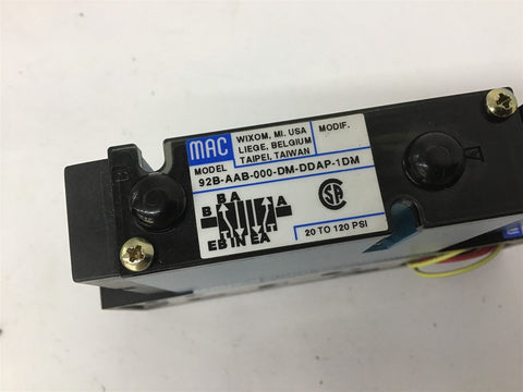 Mac 92B-AAB-000-DM-DDAP-1DM Solenoid Valve 5.4 Watts 24 Vdc 120 PSI Return Policy Returns accepted within 30 days. Items sold as is cannot be returned, unless description is in error. Buyer pays return freight. Shipping Policy We ship almost all items with 1 business day of cleared payment. We ship USPS and UPS. We can ship on your account. If you will be shipping freight, please be sure to provide all delivery contact information including a phone number. We will need to know if you have a fork lift or dock.