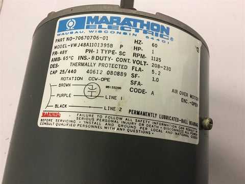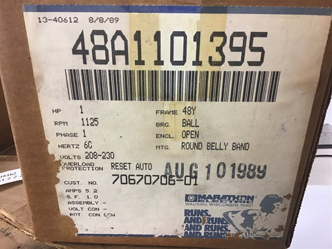 Marathon 48A1101395 1 HP AC Motor 208-230 volts 1125 Rpm 48Y Frame Return Policy Returns accepted within 30 days. Items sold as is cannot be returned, unless description is in error. Buyer pays return freight. Shipping Policy We ship almost all items with 1 business day of cleared payment. We ship USPS and UPS. We can ship on your account. If you will be shipping freight, please be sure to provide all delivery contact information including a phone number. We will need to know if you have a fork lift or dock.