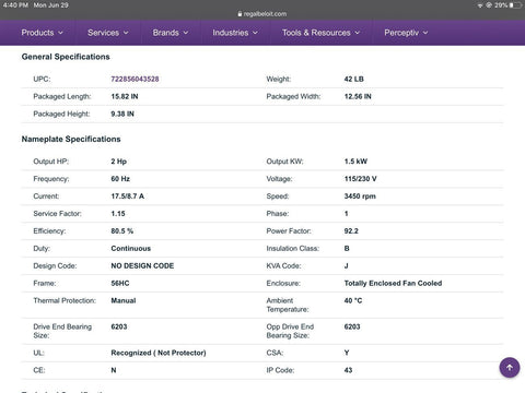 Marathon 56B34F5312 2 HP AC Motor 115/230 V Single Phase 56HC FR 3450 Rpm 2P Return Policy Returns accepted within 30 days. Items sold as is cannot be returned, unless description is in error. Buyer pays return freight. Shipping Policy We ship almost all items with 1 business day of cleared payment. We ship USPS and UPS. We can ship on your account. If you will be shipping freight, please be sure to provide all delivery contact information including a phone number. We will need to know if you have a fork lift or dock.
