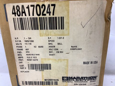 Marathon Electric 48A170247 Motor 1-3/4 HP 115/100 V 1625/1350 RPM 48Y 1PH Open Return Policy Returns accepted within 30 days. Items sold as is cannot be returned, unless description is in error. Buyer pays return freight. Shipping Policy We ship almost all items with 1 business day of cleared payment. We ship USPS and UPS. We can ship on your account. If you will be shipping freight, please be sure to provide all delivery contact information including a phone number. We will need to know if you have a fork lift or dock.