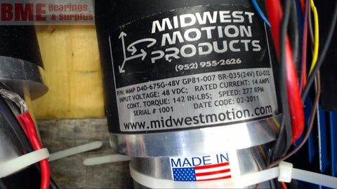 MIDWEST MOTION PRODUCTS MMP D40-675G-48V GP81-007 BR-035, 48 VDC Return Policy Returns accepted within 30 days. Items sold as is cannot be returned, unless description is in error. Buyer pays return freight. Shipping Policy We ship almost all items with 1 business day of cleared payment. We ship USPS and UPS. We can ship on your account. If you will be shipping freight, please be sure to provide all delivery contact information including a phone number. We will need to know if you have a fork lift or dock.