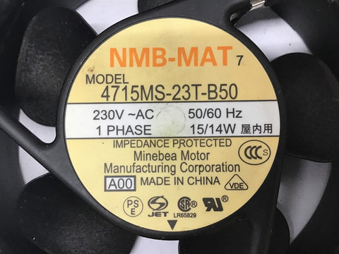 Minebea Motor NMB-MAT 4715MS-23T-B50 Cooling Fan 230 VAC 50/60 Hz 1 PH 15/14 W Return Policy Returns accepted within 30 days. Items sold as is cannot be returned, unless description is in error. Buyer pays return freight. Shipping Policy We ship almost all items with 1 business day of cleared payment. We ship USPS and UPS. We can ship on your account. If you will be shipping freight, please be sure to provide all delivery contact information including a phone number. We will need to know if you have a fork lift or dock.