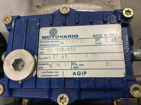 Motovario 0.45 KW 230/460 Volts 1710 RPM 3 Phase Gearmotor 36.17 Ratio Return Policy Returns accepted within 30 days. Items sold as is cannot be returned, unless description is in error. Buyer pays return freight. Shipping Policy We ship almost all items with 1 business day of cleared payment. We ship USPS and UPS. We can ship on your account. If you will be shipping freight, please be sure to provide all delivery contact information including a phone number. We will need to know if you have a fork lift or dock.