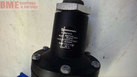 NORGREN 11-002-013 REGULATOR 400 PSI INLET, 125 PSI OUTLET Return Policy Returns accepted within 30 days. Items sold as is cannot be returned, unless description is in error. Buyer pays return freight. Shipping Policy We ship almost all items with 1 business day of cleared payment. We ship USPS and UPS. We can ship on your account. If you will be shipping freight, please be sure to provide all delivery contact information including a phone number. We will need to know if you have a fork lift or dock.