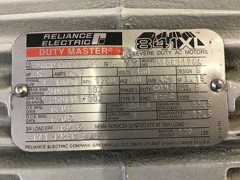 Reliance P18S1176A AC Motor 5HP 460V 1750RPM 4P 184TC 3PH 60Hz TEFC Return Policy Returns accepted within 30 days. Items sold as is cannot be returned, unless description is in error. Buyer pays return freight. Shipping Policy We ship almost all items with 1 business day of cleared payment. We ship USPS and UPS. We can ship on your account. If you will be shipping freight, please be sure to provide all delivery contact information including a phone number. We will need to know if you have a fork lift or dock.