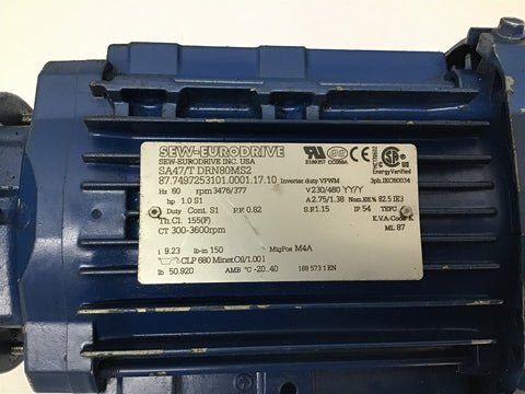 SEW-EURODRIVE SA47/T DRN80MS2 Gearmotor 1 HP 230/460 V 3476/377 RPM 60 Hz TEFC Return Policy Returns accepted within 30 days. Items sold as is cannot be returned, unless description is in error. Buyer pays return freight. Shipping Policy We ship almost all items with 1 business day of cleared payment. We ship USPS and UPS. We can ship on your account. If you will be shipping freight, please be sure to provide all delivery contact information including a phone number. We will need to know if you have a fork lift or dock.