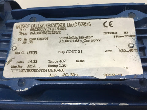 Sew Eurodrive WA30DRS71M4/Z 3/4 Hp 220-242/380-420 V 1360/95 Rpm 3 PH 60 Hz