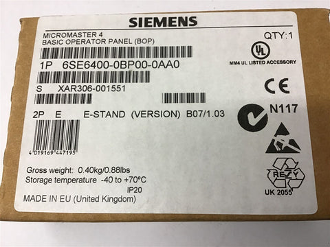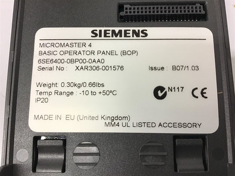 Siemens 6SE6400-0BP00-0AA0 Micromaster 4 Basic Operator Panel Return Policy Returns accepted within 30 days. Items sold as is cannot be returned, unless description is in error. Buyer pays return freight. Shipping Policy We ship almost all items with 1 business day of cleared payment. We ship USPS and UPS. We can ship on your account. If you will be shipping freight, please be sure to provide all delivery contact information including a phone number. We will need to know if you have a fork lift or dock.