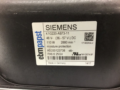 Siemens K1G220-AB73-1190 Fan 48 VDC 110 Watt 2880 RPM Return Policy Returns accepted within 30 days. Items sold as is cannot be returned, unless description is in error. Buyer pays return freight. Shipping Policy We ship almost all items with 1 business day of cleared payment. We ship USPS and UPS. We can ship on your account. If you will be shipping freight, please be sure to provide all delivery contact information including a phone number. We will need to know if you have a fork lift or dock.