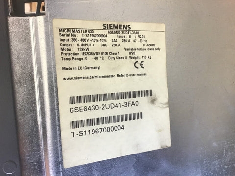 Siemens Micromaster 430 6SE6430-2UD41-3FAO Drive 250 Amp 132 KW Return Policy Returns accepted within 30 days. Items sold as is cannot be returned, unless description is in error. Buyer pays return freight. Shipping Policy We ship almost all items with 1 business day of cleared payment. We ship USPS and UPS. We can ship on your account. If you will be shipping freight, please be sure to provide all delivery contact information including a phone number. We will need to know if you have a fork lift or dock.