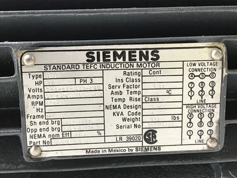 Siemens RGZ 10 HP AC Motor 220-230/440-460 Volts 1735 RPM 4P 215T Return Policy Returns accepted within 30 days. Items sold as is cannot be returned, unless description is in error. Buyer pays return freight. Shipping Policy We ship almost all items with 1 business day of cleared payment. We ship USPS and UPS. We can ship on your account. If you will be shipping freight, please be sure to provide all delivery contact information including a phone number. We will need to know if you have a fork lift or dock.