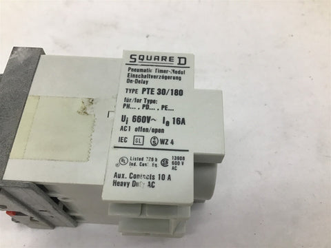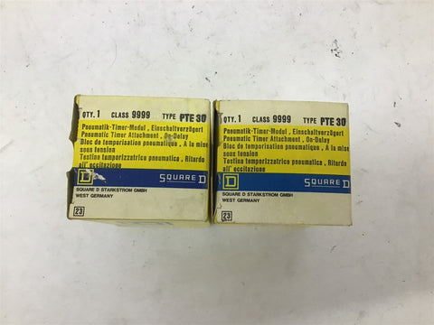 Square D Class 9999 Type PTE 30 Pneumatic Timer Attachment 16 A 660 V Lot Of 2 Return Policy Returns accepted within 30 days. Items sold as is cannot be returned, unless description is in error. Buyer pays return freight. Shipping Policy We ship almost all items with 1 business day of cleared payment. We ship USPS and UPS. We can ship on your account. If you will be shipping freight, please be sure to provide all delivery contact information including a phone number. We will need to know if you have a fork lift or dock.