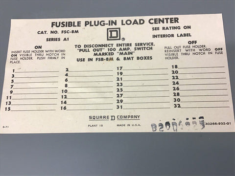Square D FSC-8M Fusible Plug-In Load Center Series A1 Return Policy Returns accepted within 30 days. Items sold as is cannot be returned, unless description is in error. Buyer pays return freight. Shipping Policy We ship almost all items with 1 business day of cleared payment. We ship USPS and UPS. We can ship on your account. If you will be shipping freight, please be sure to provide all delivery contact information including a phone number. We will need to know if you have a fork lift or dock.