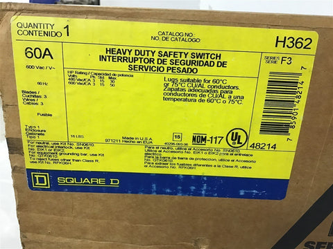 Square D H362 Heavy duty Safety Switch 60 Amp 600 Vac Return Policy Returns accepted within 30 days. Items sold as is cannot be returned, unless description is in error. Buyer pays return freight. Shipping Policy We ship almost all items with 1 business day of cleared payment. We ship USPS and UPS. We can ship on your account. If you will be shipping freight, please be sure to provide all delivery contact information including a phone number. We will need to know if you have a fork lift or dock.
