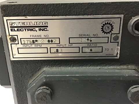 Sterling 175BR020002 20:1 Ratio Left Angle Gear Reducer .83 HP Return Policy Returns accepted within 30 days. Items sold as is cannot be returned, unless description is in error. Buyer pays return freight. Shipping Policy We ship almost all items with 1 business day of cleared payment. We ship USPS and UPS. We can ship on your account. If you will be shipping freight, please be sure to provide all delivery contact information including a phone number. We will need to know if you have a fork lift or dock.