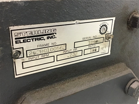 Sterling 262BQ100562 Left Angle Gear Reducer 100:1 Ratio .232 Input HP Return Policy Returns accepted within 30 days. Items sold as is cannot be returned, unless description is in error. Buyer pays return freight. Shipping Policy We ship almost all items with 1 business day of cleared payment. We ship USPS and UPS. We can ship on your account. If you will be shipping freight, please be sure to provide all delivery contact information including a phone number. We will need to know if you have a fork lift or dock.