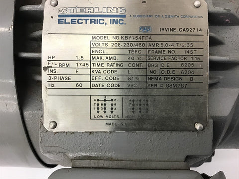 Sterling electric KBY154FFA 1 1/2 HP AC Motor 208-230/460 volts 1800 Rpm 145T Fr Return Policy Returns accepted within 30 days. Items sold as is cannot be returned, unless description is in error. Buyer pays return freight. Shipping Policy We ship almost all items with 1 business day of cleared payment. We ship USPS and UPS. We can ship on your account. If you will be shipping freight, please be sure to provide all delivery contact information including a phone number. We will need to know if you have a fork lift or dock.