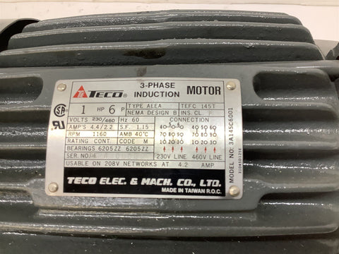TECO 3A145C6001 AC Motor 1HP 230/460V 1160RPM 60HZ 6P TEFC 145T