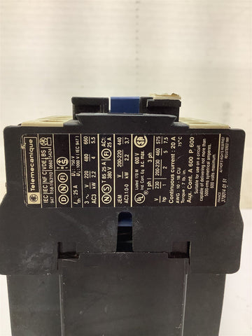 Telemecanique LP1 D0910 Contactor 460 V @ 5 Hp 24 V Coil Return Policy Returns accepted within 30 days. Items sold as is cannot be returned, unless description is in error. Buyer pays return freight. Shipping Policy We ship almost all items with 1 business day of cleared payment. We ship USPS and UPS. We can ship on your account. If you will be shipping freight, please be sure to provide all delivery contact information including a phone number. We will need to know if you have a fork lift or dock.